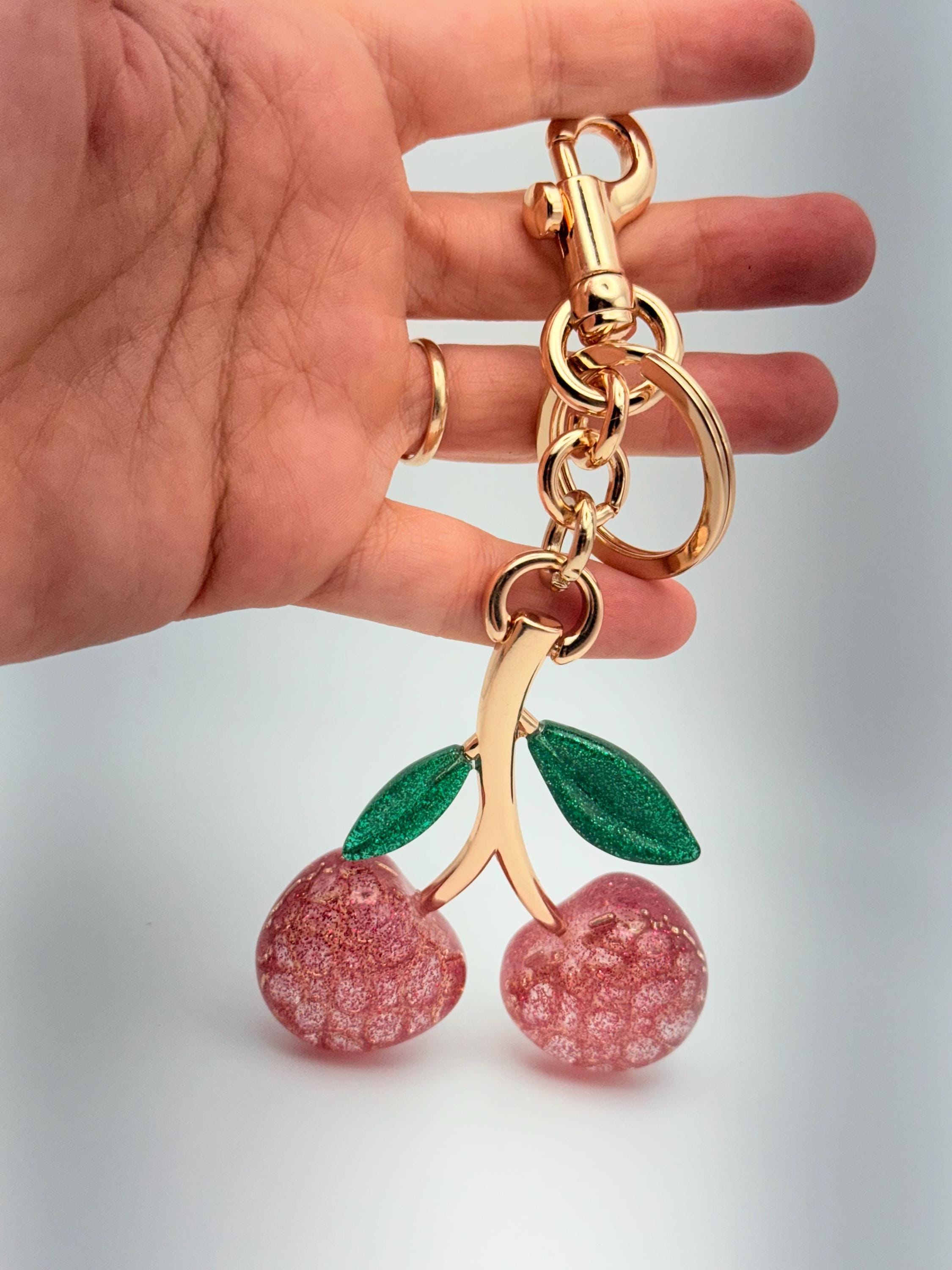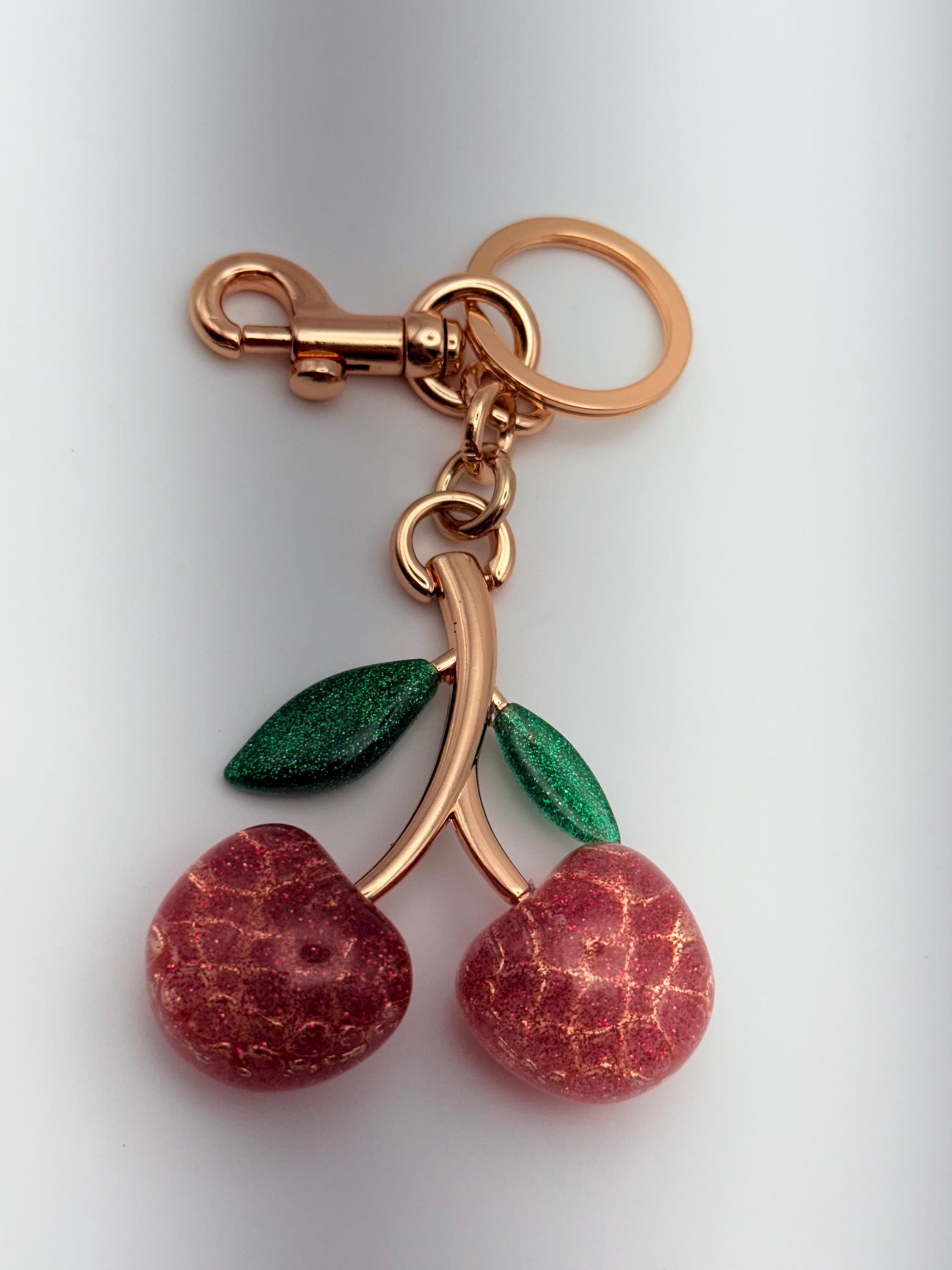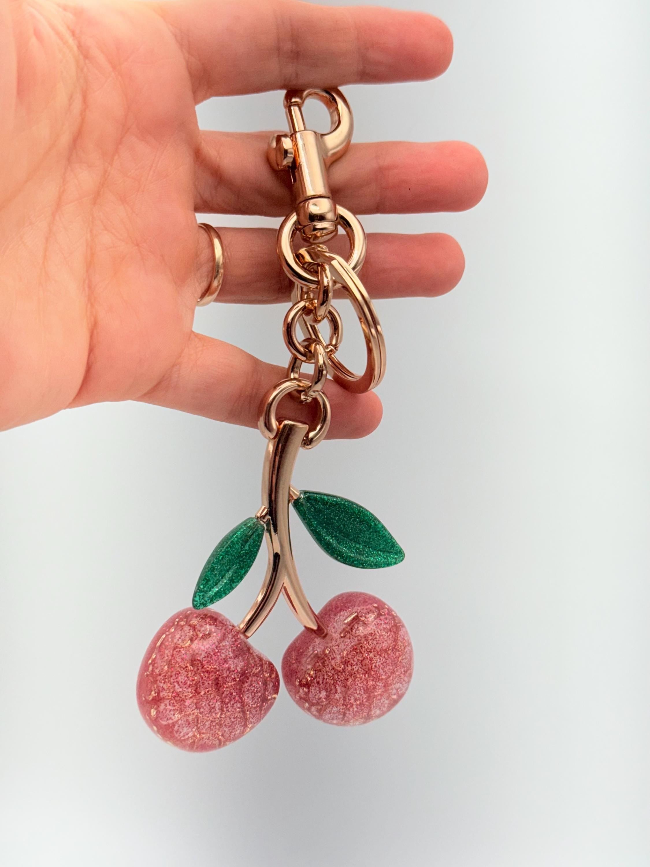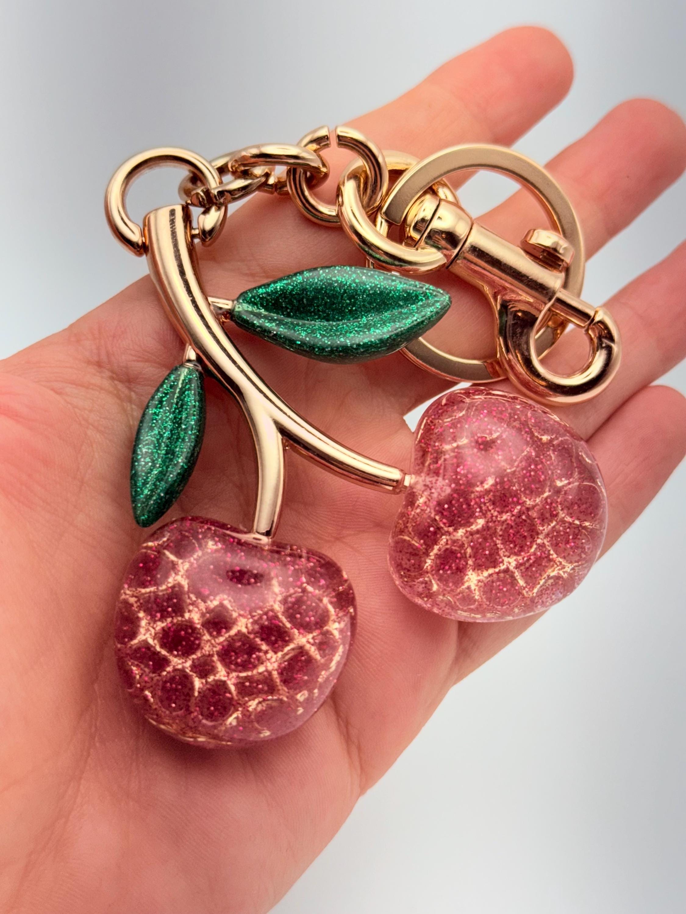 Glitter Cherry Keychain with Rose Gold Stem – Sparkly Red Resin Fruit Charm with Green Leaves | Cute Bag Accessory or Gift