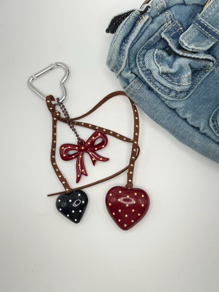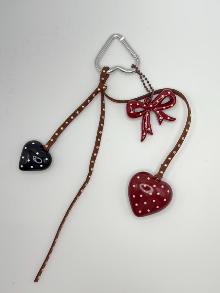 Heart & Bow Bag Charm – Polka Dot Keychain with Red and Black Hearts, Girly Purse Accessory